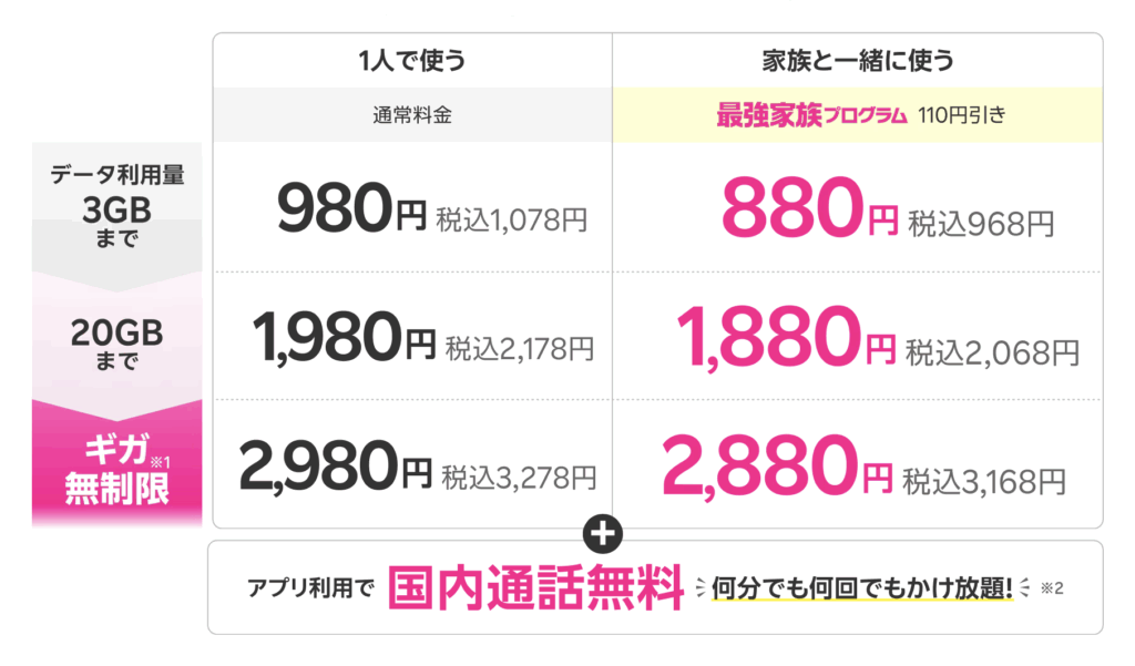 3GBまで980円、20GBまで1,980円、ギガ無制限2,980円。